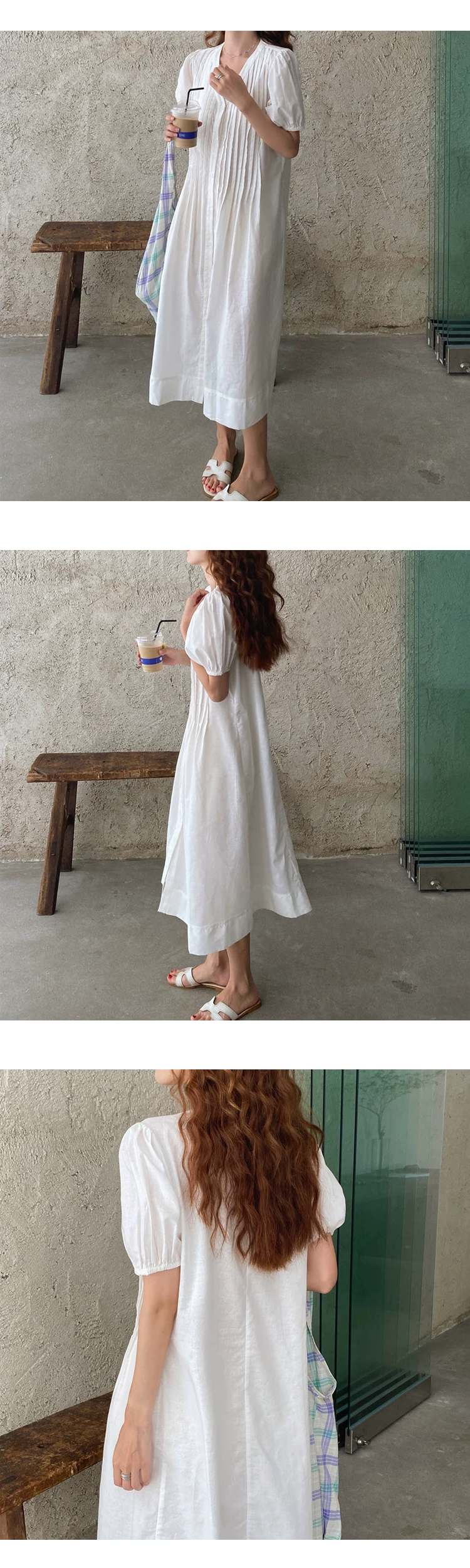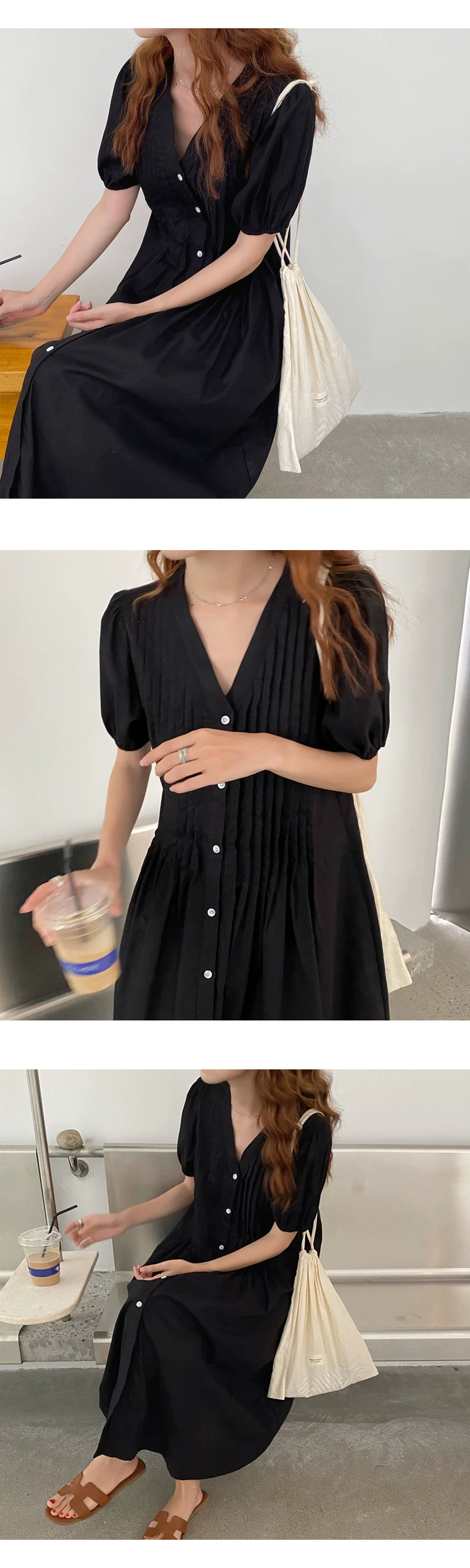 ONN/[OPS1462]여성 브이넥 여름 핀턱 퍼프 반팔 롱 원피스  로브스타일 체형 커버 아이보리 블랙  55~66