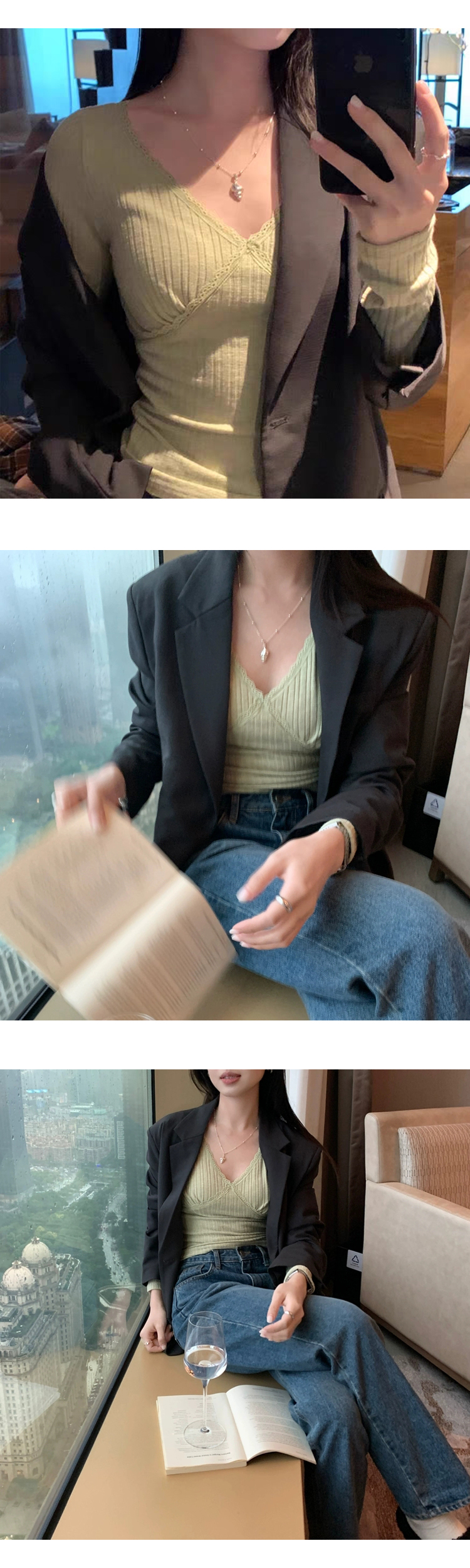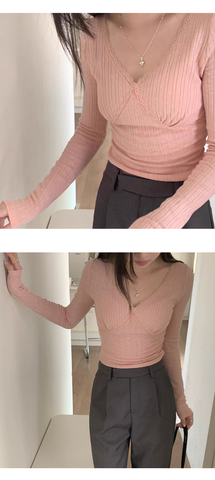 ONN/ [T299]레이스 골지 티셔츠 러블리룩 파인 브이넥 골지 셔츠 이너웨어 페미닌룩 일상룩 나들이룩